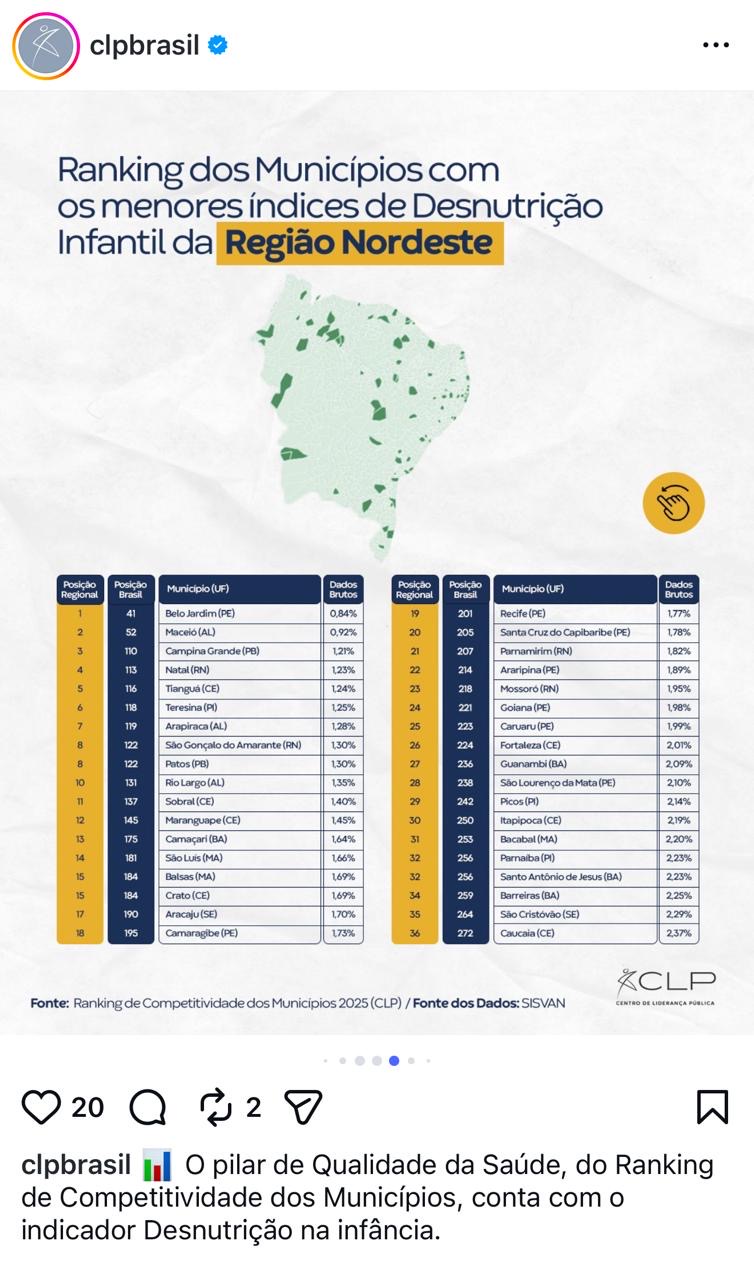 O pilar de Qualidade da Saúde, do Ranking de Competitividade dos Municípios relativos ao ano de 2025, conta com o indicador Desnutrição na infância. Neste âmbito, a gestão do prefeito Bruno Cunha Lima em Campina Grande se destacou como sendo a cidade paraibana com menor índice de Desnutrição Infantil, além disso, alcançou o 3º menor índice no Nordeste e a 110º entre os mais de 5 mil municípios brasileiros.